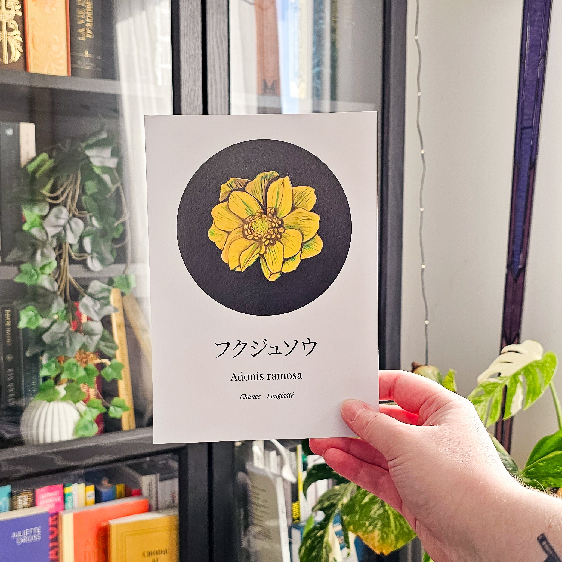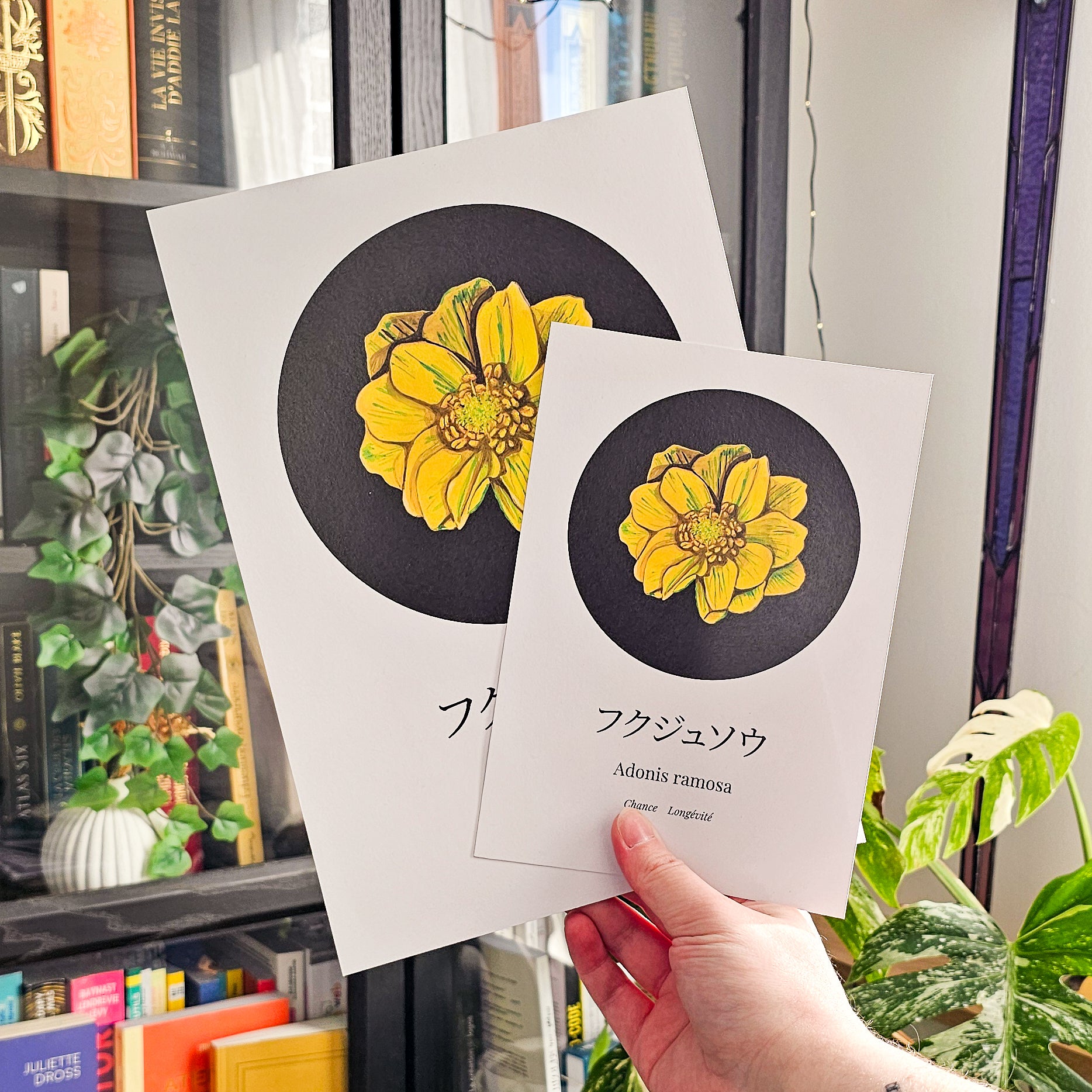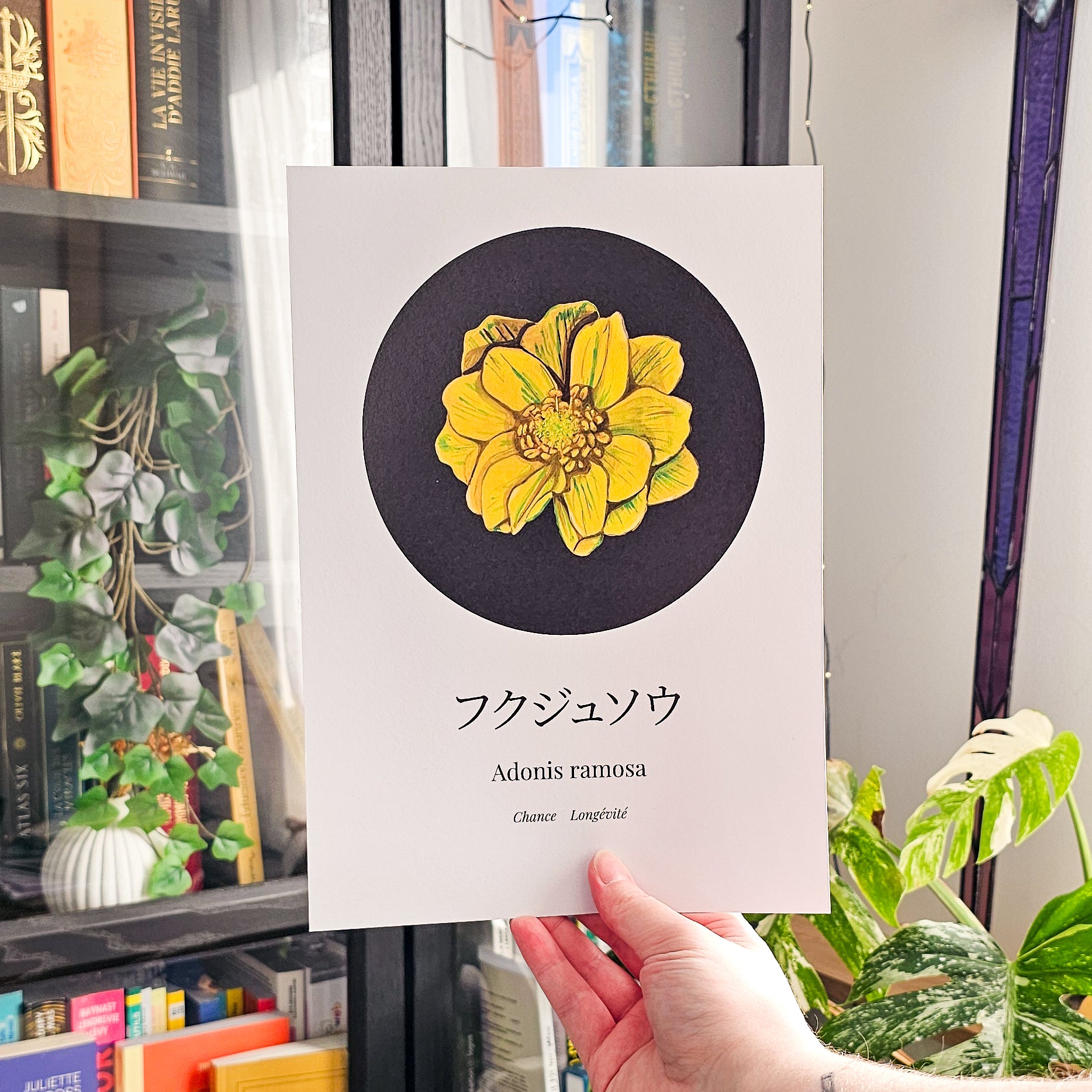Imagine une fleur si lumineuse qu'elle annonce la chance et la prospérité dès les premiers jours de l'année. L'adonis du Japon (フクジュソウ – fukujusō) est cette fleur. Peinte à la gouache, cette illustration botanique capture l'éclat solaire d'un symbole de longévité et de bonheur, traditionnellement offert lors du Nouvel An japonais pour attirer fortune et bonne santé🌼