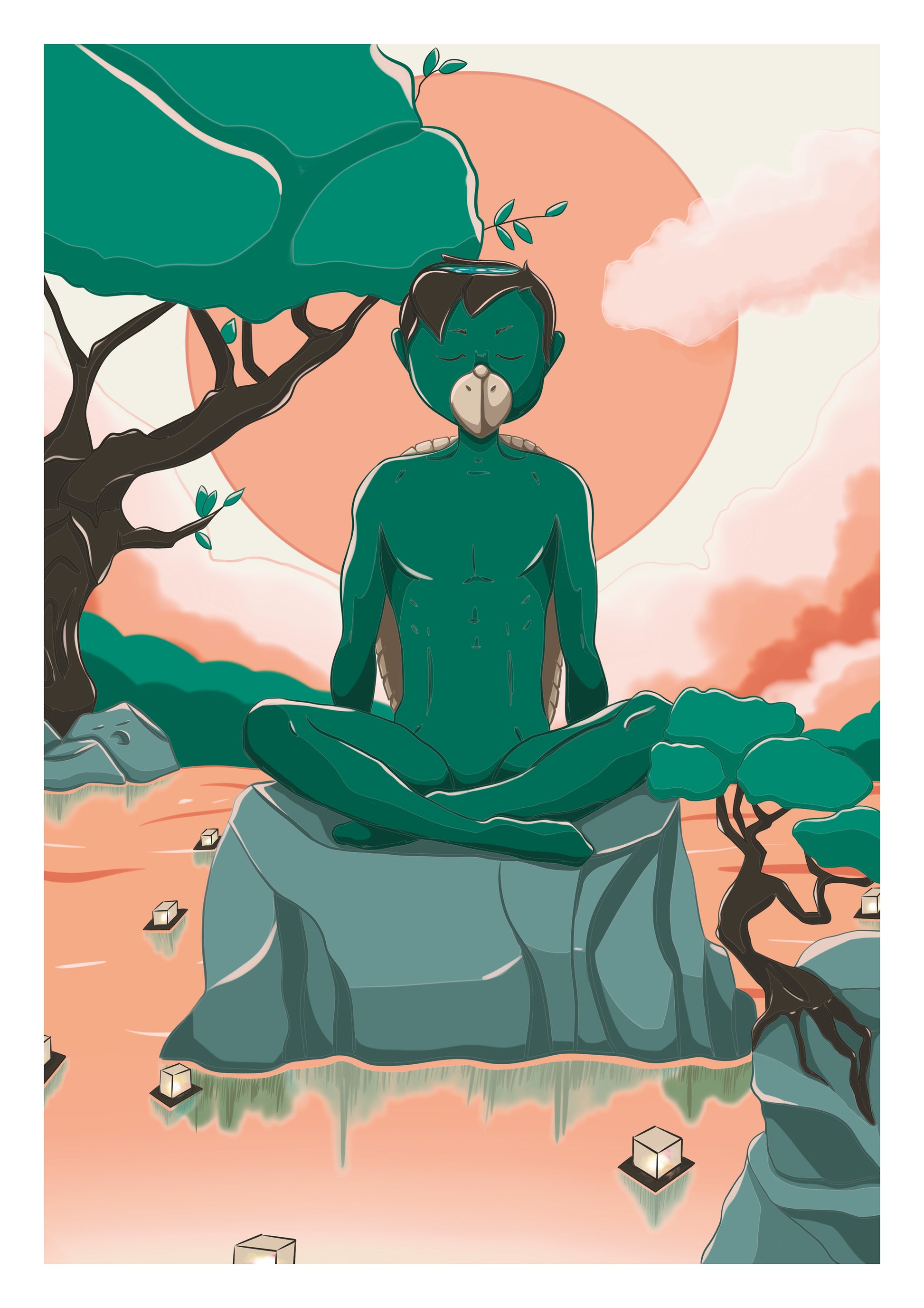 Prends place à côté d'un kappa méditant sereinement sur un rocher entouré d'eau, baigné dans la lumière douce du crépuscule, incarnant la sagesse de la mythologie japonaise.