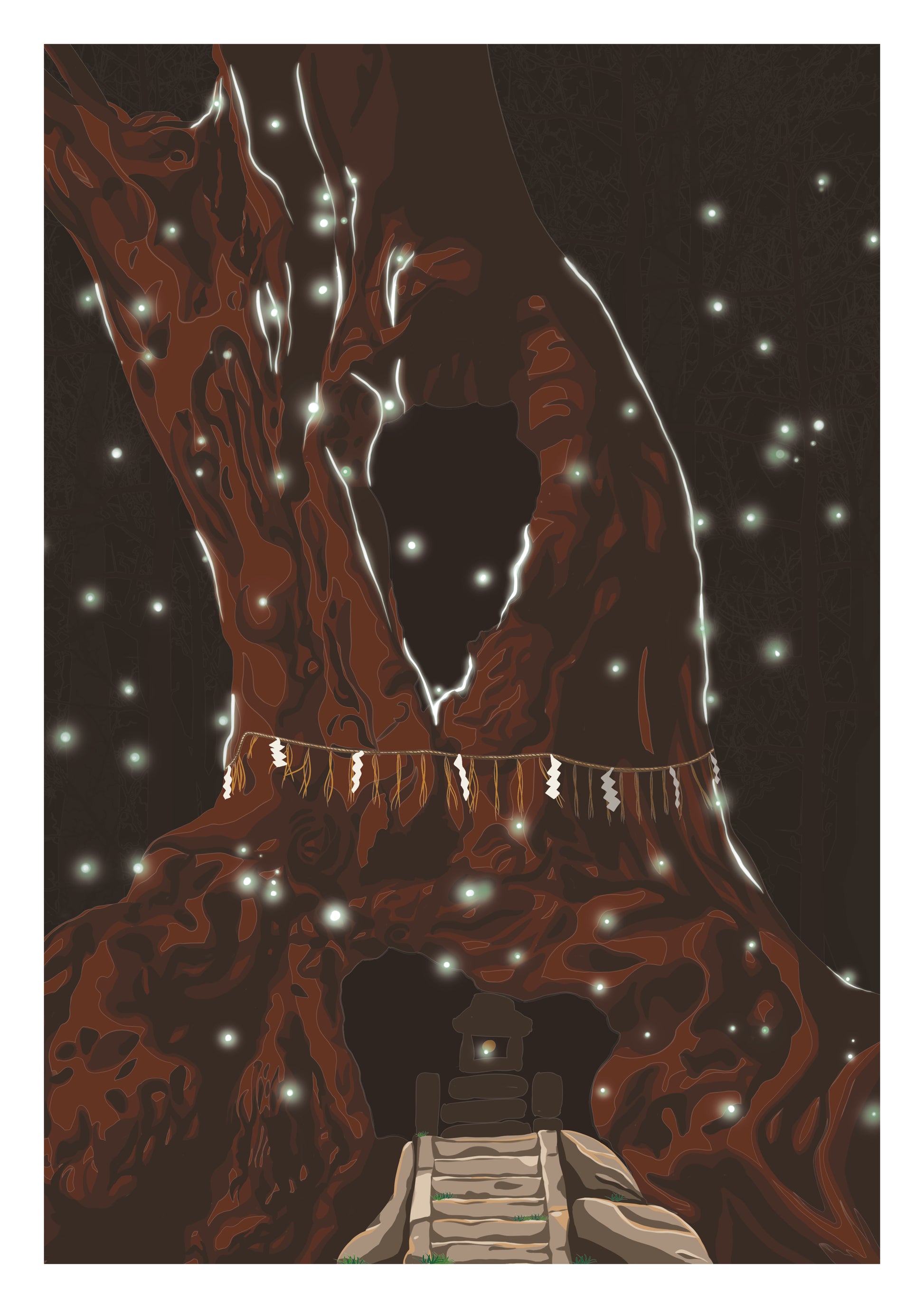Explore la forêt japonaise avec les kodama, esprits sacrés, veillant sur un arbre centenaire entouré d'un Shimenawa.