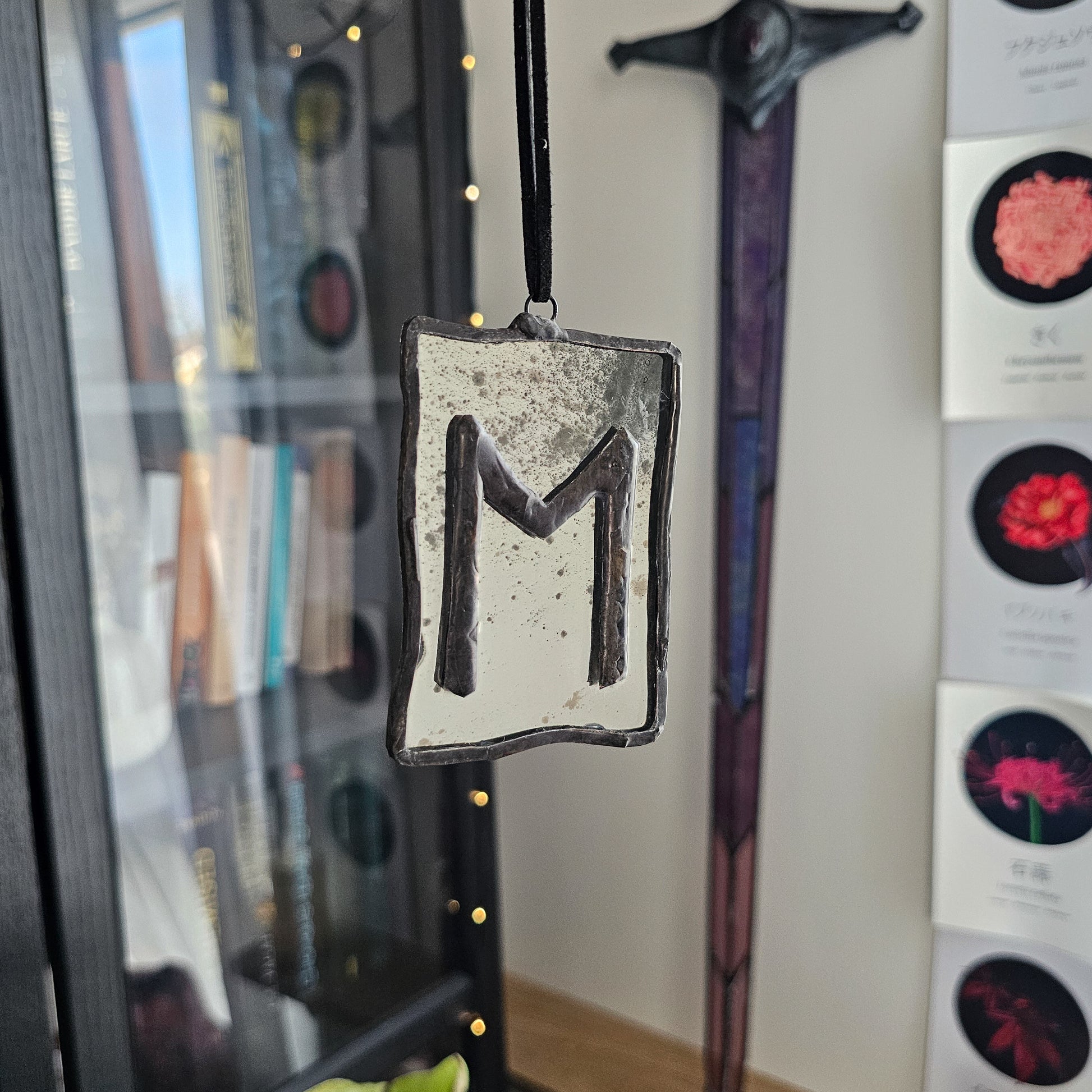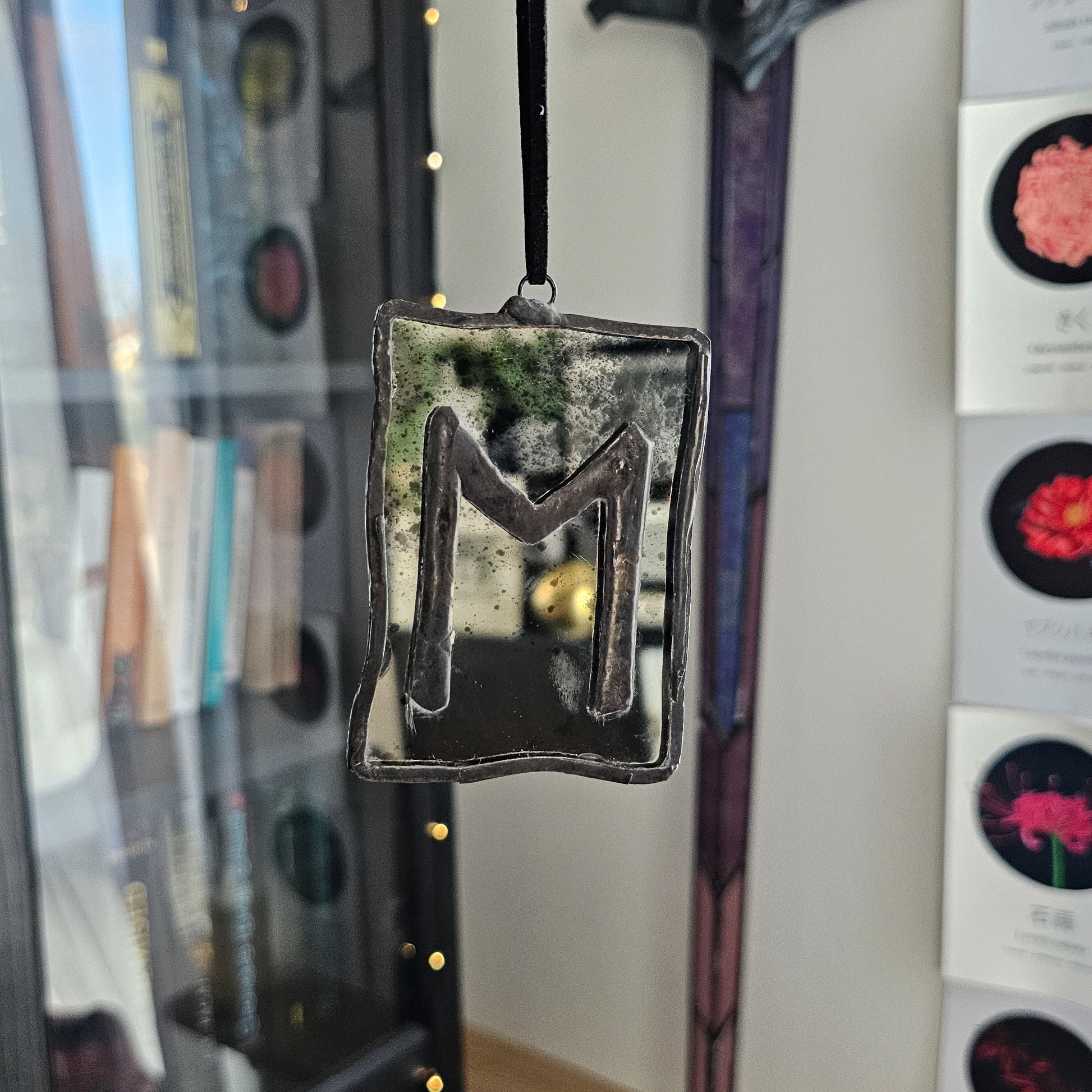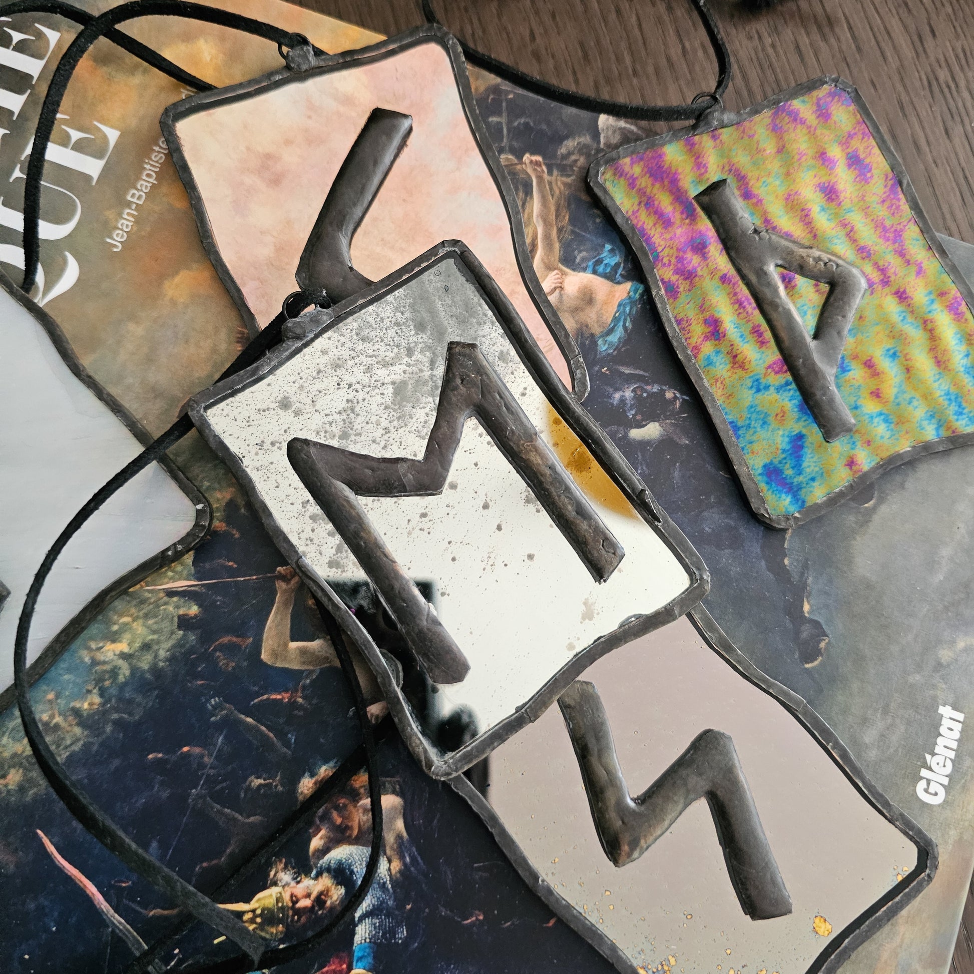 Ce petit vitrail talisman est réalisé sur verre miroir Luna, aux reflets doux et nacrés qui évoquent la lumière de la lune sur un chemin nocturne. La rune est soudée en relief, bordée d'étain patiné