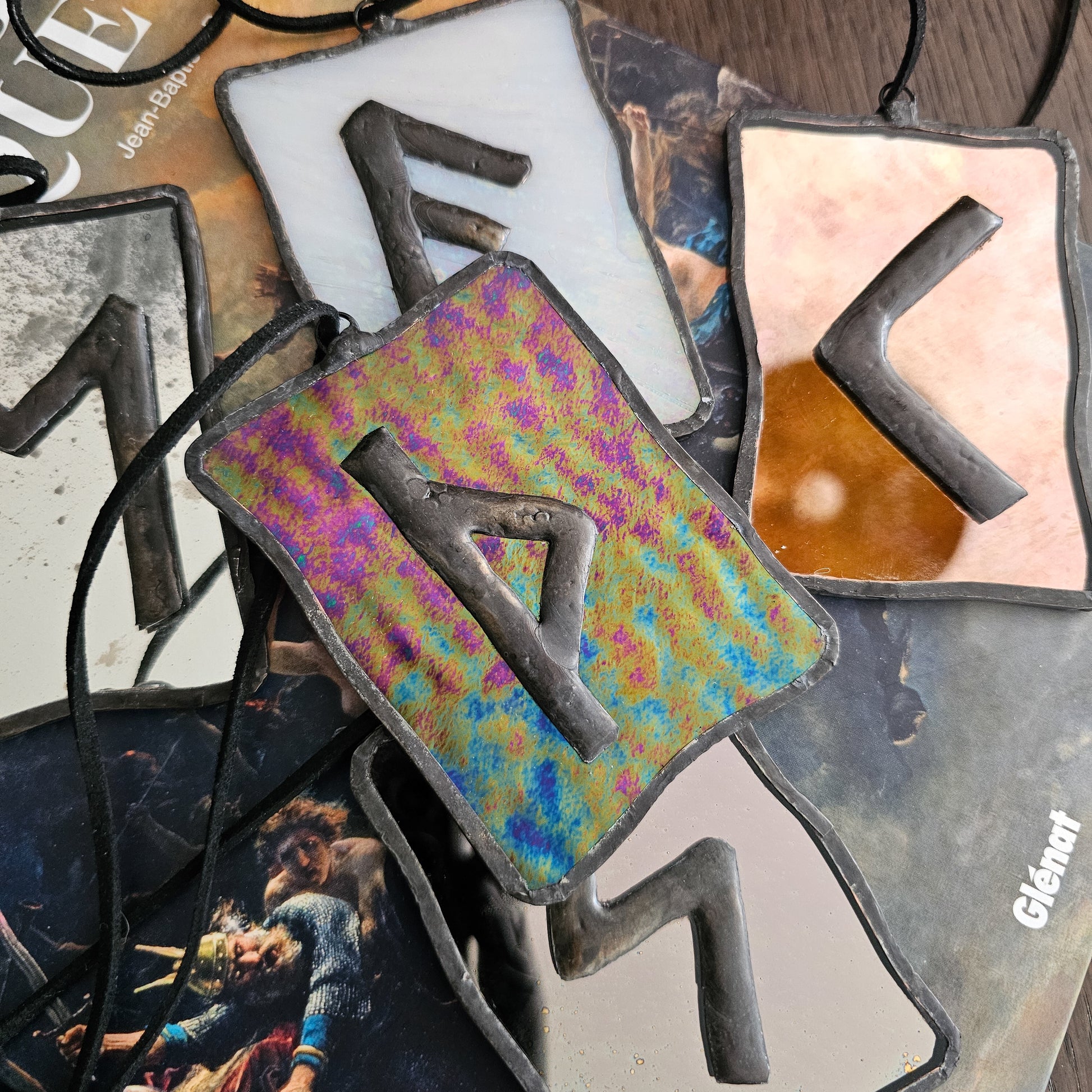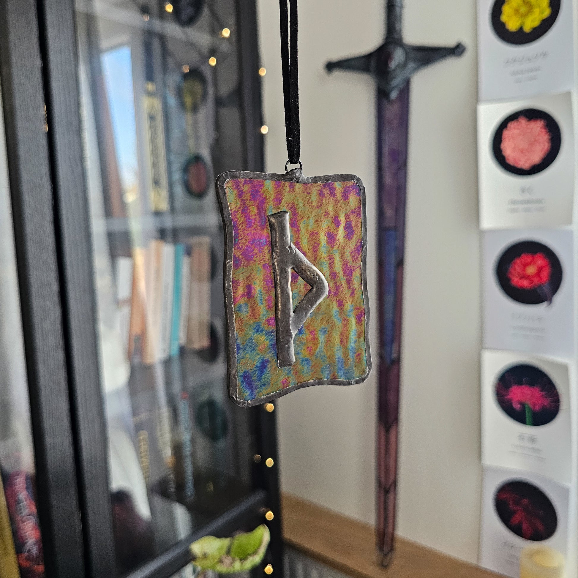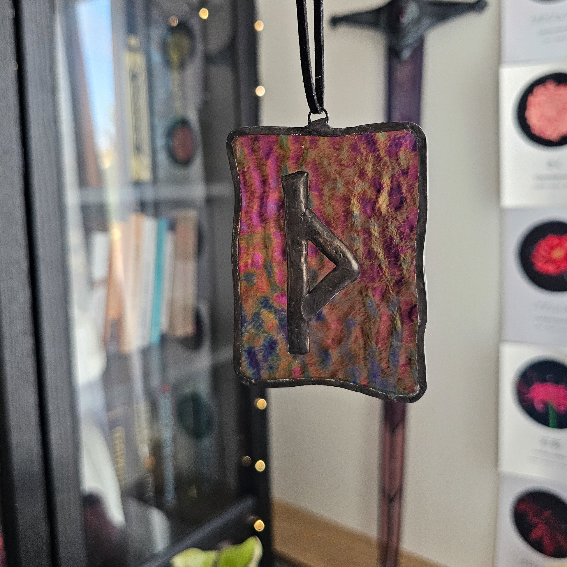 Ce petit vitrail talisman est réalisé sur verre violet foncé iridescent Ripple, un verre aux ondulations profondes et aux reflets changeants qui captent la lumière comme une surface troublée. La rune est soudée en relief, bordée d'étain patiné